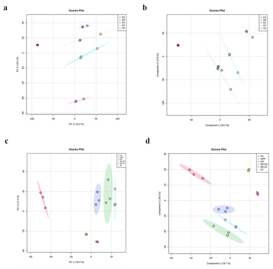 PCA and PLS-DA model plots. Strawberry: (a) PCA plot, (b) PLS-DA plot. Apple: (c) PCA plot, (d) PLS-DA plot. Strawberry samples: Fresh strawberries (FS), No heat treatment (NT), mild heat treatment (MT), standard thermal treatment (ST), vacuum concentration (VC). Apple samples: Fresh apple (FA), high-pressure processing (HPP), mild heat treatment (MT), standard thermal treatment (ST), reprocessed mild heat treatment (RP.MT), reprocessed standard thermal treatment (RP.ST).