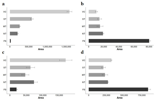 Bar plot of the metabolites identified in strawberry puree across the processing sample groups. X-axis: total abundance of the metabolite; Y-axis: treatment. (a) Pyroglutamic acid; (b) Pteroyl-D-glutamic acid; (c) 4-hydroxy-3-methoxy benzoic acid; (d) 2-hydroxybenzoic acid β-d-glucoside. Strawberry samples: Fresh strawberries (FS), No heat treatment (NT), mild heat treatment (MT), standard thermal treatment, vacuum concentration (VC).
