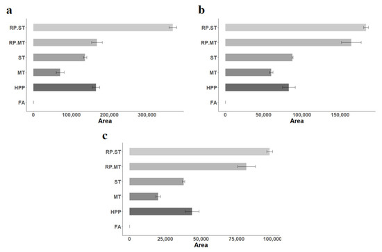 Bar plot of the metabolites identified in apple puree across the processing sample groups. X-axis: total abundance of the metabolite; Y-axis: treatment; (a) hydroxycinnamic acid glucuronide; (b) Caffeic acid; (c) LysoPE(18:3(9Z,12Z,15Z)/0:0). Apple samples: Fresh apple (FA), High-pressure processing (HPP), mild heat treatment (MT), standard thermal treatment (ST), reprocessed mild heat treatment (RP.MT), reprocessed standard thermal treatment (RP.ST).
