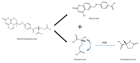 In the case of strawberries, we found that pteroyl-D-glutamic acid could be a marker of non-processed fruits. Pteroyl-D-glutamic acid, the active metabolite of folic acid [21], is essential to prevent congenital malformations such as neural tube defects [22]. Folic acid and its derivatives are present in meat products (chicken liver), leafy green vegetables (spinach, parsley), grains (green beans, peas, chickpeas), and fruits (apple, orange, strawberry), with concentrations ranging from 1 to 580 µg of folate/100 g fresh weight [23,24]. Due to processing, a significant decrease in pteroyl-D-glutamic acid was observed in strawberries. These folates have been reported to be sensitive to oxygen exposure, light intensity, and thermal treatments [23]. Depending on the intensity of the processing conditions, folates could be transformed into their less available derivatives, resulting in losses ranging from 10% to 80% [25]. The decrease in pteroyl D-glutamic acid came with an increase in pyroglutamic acid, which was identified as an upregulated marker of processing in strawberry puree (Figure 2a). These results suggest that the pteroyl-D-glutamic acid in fresh strawberries is degraded with the temperature, releasing pteroic acid and glutamic acid. Then, glutamic acid is converted into pyroglutamic acid due to the loss of a water molecule and internal cyclization (Figure 4). Both metabolites, pteroic acid and glutamic, were not detected in samples, most likely due to the further degradation of pteroic acid into other molecules and the total conversion of glutamic acid to pyroglutamic acid. Transformation of glutamic acid or glutamine to pyroglutamic acid has been previously reported through enzymatic or non-enzymatic reactions [26,27]. Pyroglutamic acid formation after enzymatic reactions have been registered in dairy, meat, and fermented products, whereas that produced after non-enzymatic reactions, has been described for tomato puree and beer [28,29,30]. Prior research has also found that levels of pyroglutamic acid in foods influence various sensory attributes, such as metallic aroma and bitter taste [29,31]. In addition, evidence shows that L-pyroglutamic acid induces the formation of lower-molecular-weight colored products through non-enzymatic browning reactions [32]. Accordingly, accurately identifying this compound with the authentic standard supports pyroglutamic acid as a good marker of strawberry processing.