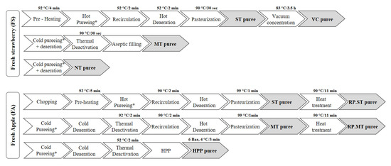This research involves the study of two fruit products, strawberry, and apple purees, processed through different industrial processing techniques, as reported previously [17] (Figure 5). A total of 15 tons of strawberries (Fragaria × ananassa) of cultivar Primoris (Huelva, Spain) and 10 tons of apples (Malus domestica) of cultivar Golden Delicious (Zaragoza, Spain) were harvested ripe and transported under refrigeration conditions to the processing facility. The total amount of fruits was equally distributed to the different industrial processing technologies used to obtain purees from strawberries and apples [17].
