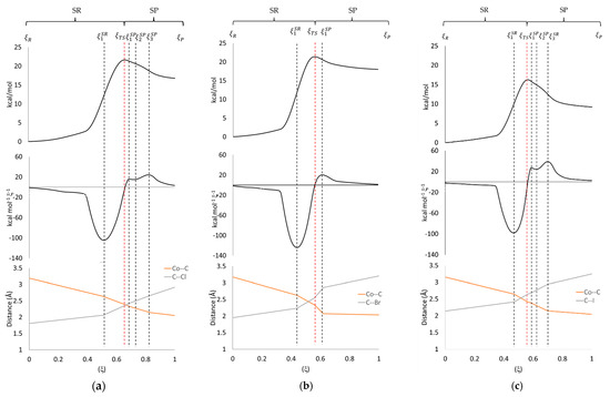 IRCs and reaction force curves, calculated at uωB97-XD/6–311++G(d,p) level, for (a) Cl, (b) Br and (c) I as the leaving group in reaction. The dashed lines show the position of critical points in the normalized reaction coordinate.