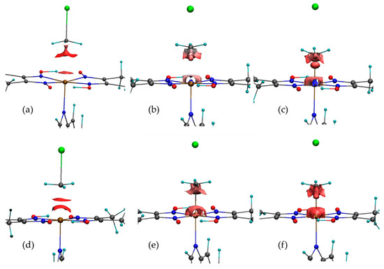 Representation of the computed at (a) (isovalue = 0.200 bte), (b) (isovalue = 0.341 bte), (c) (isovalue 0.375 bte) for the reductive de halogenation mediated by CoICbx and at (d) (isovalue = 0.340 bte), (e) (isovalue = 0.302 bte), (f) (isovalue = 0.340 bte) for the reaction mediated by CoIICbx. C atoms are in gray, with Co in ochre, N in blue, O in red and Cl in green.