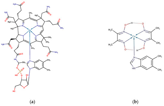 Schematic representations of compounds (a) cobalamin and (b) 5,6-dimethylbenzimidazole-bis(dimethylglyoximate)cobalt(II) (cob[II]aloxime or CoIICbx).