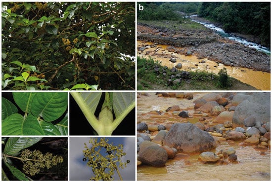 (a) Habitus, leaves, stipules and infructescence with fruits of Palicourea luxurians (Rubiaceae: Palicoureeae) growing on the steep riverbanks of Río Sucio; (b) Confluence of Río Sucio (brownish-yellowish, foreground) and Río Honduras (blue, background) near the bridge of Route 32 through pristine Braulio Carrillo National Park. The color of the river indicates deposits of schwertmannite, a yellowish-brownish sulfate containing iron oxide [27]. All photos: A. Berger.