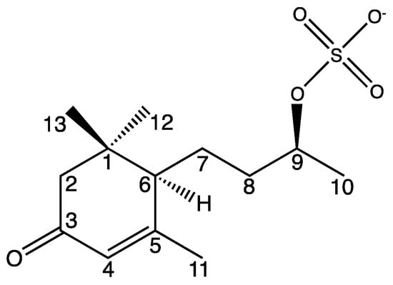 The newly described compound (6R,9R)-1 is named blumenol C sulfate (1) and is depicted in Figure 4. Naming as well as the numbering of the carbon atoms was based on the known blumenol C [25] and its derivative blumenol C glucoside [24]. A list of the NMR data of blumenol C sulfate (1) is presented in Table 1 and relevant spectra are provided in the Supplementary Material (Figures S1–S7).