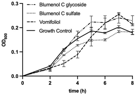 The bacterial strains E. coli and B. subtilis were chosen as test-organisms as they were also used by Kuene et al. [16] in their study with vomifoliol which allows the comparison of results. The additional use of an ampicillin-resistant E. coli strain served to indicate potential antimicrobial activity of the compounds against antibiotic-resistant bacteria. Blumenol C sulfate (1), as well as vomifoliol, showed weak antibacterial effects against B. subtilis when applied at concentration of 200 µg mL−1 (Figure 5), however for blumenol C glucoside no antibacterial effects can be reported at the tested concentration. Compound 1 led to a moderate decrease of the growth of B. subtilis up to 7 h of incubation. Vomifoliol reduced the growth of B. subtilis strongly up to 4 h of incubation compared to the growth control. However, with increasing incubation time, the antibacterial effect diminishes.