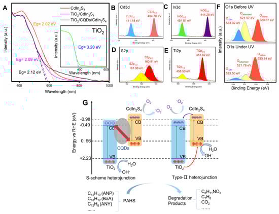 (A) UV-vis DRS of CdIn2S4, TiO2/CdIn2S4 and TiO2/CQDs/CdIn2S4; (B–E) XPS spectra of the main elements in TiO2/CQDs/CdIn2S4; (F) In-situ XPS spectra of O1s orbital in TiO2/CQDs/CdIn2S4, the data was collected with/without 365 nm irradiation; (G) The band position and charge transfer of S-scheme photocatalytic reaction process of TiO2/CQDs/CdIn2S4 and the type-II photocatalytic reaction process of TiO2/CdIn2S4 under illumination.