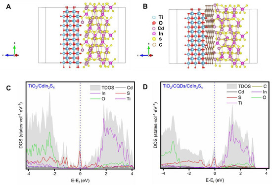The crystal structures of (A) TiO2/CdIn2S4 and (B) TiO2/CQDs/CdIn2S4; density of states of (C) TiO2/CdIn2S4 and (D) TiO2/CQDs/CdIn2S4.