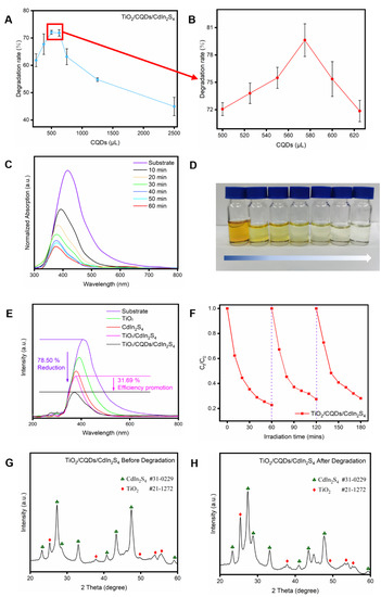 In terms of the photocatalytic performance, the ratio of CQDs in TiO2/CQDs/CdIn2S4 presented a strong impact on the photocatalytic degradation rate over PAHs (Figure 4A). Namely, the photocatalytic activity increased with the increased ratio of CQDs, it and reached the zenith at 20 to 30 mg/L, which was then followed with a deceased activity. This may be due to the overloading of CQDs leading to a reduced charge transfer efficiency between TiO2 and CdIn2S4, which suppresses the S-scheme features of the photocatalysts. To further optimize the ratio of CQDs, we tested the range of CQDs between 20 to 25 mg/L, in which the 23 mg/L presented a degradation rate up to 78.5% (Figure 4B). As illustrated in Figure 4C, the color of the substrate changed from the initial brown to a transparent colorless solvent in 1 h photocatalytic process. In addition to the loss of color, a blue shift of the absorption maximum (from 430 to 385 nm) was also monitored during the photocatalytic reaction (Figure 4D). As it is known that the molecular structure can be reflected by the absorption spectra, to be specific, a decreased number of conjugated carbon-carbon double bonds typically result in an absorption spectrum with a shorter wavelength [70]. In our case, the blue shift suggests that carbon–carbon double bonds in PAHs is possibly destroyed during the photocatalytic degradation. The comparison of the degradation performances among the serials of samples were exhibited in Figure 4E, particularly, the loading of rational content of CQDs between TiO2 and CdIn2S4 dramatically improved the photocatalytic activity, comparing to the control group (from 45.81 to 78.50%), suggesting the photoactivity can be efficiently promoted by adding CQDs. Furthermore, the PAHs degradation performance was compared as shown in Table 2. Besides, the stability of TiO2/CQDs/CdIn2S4 was checked by repeating the experiments 3 times using the recycled samples (Figure 4F) Comparing to the initial cycle, ca. 7.2% photoactivity loss was observed in the second cycle. Meanwhile, for further confirming the stability of photocatalysts in PAHs degradation, as shown in Figure S7, 97.6% samples were retained in the two TiO2/CQDs/CdIn2S4 sample groups after 5 h photocatalytic degradation. While in the third cycle, the photoactivity loss was less than 2%, relative to the second cycle. As confirmed by PXRD (Figure 4G,H), the characteristic patterns of TiO2/CQDs/CdIn2S4 basically remain the same after 3 reaction cycles. As depicted in Figure S8, the hot filtration test was conducted to confirm the compatibility of TiO2/CQDs/CdIn2S4 photocatalysts [71]. After 10 min of reaction under simulated sunlight (degradation of 65.2% PAHs), the photocatalyst was removed and filtered. Then the filtrate was illuminated for another 50 min under the same condition with no significant increase in degradation, confirming that no leaching of the photocatalyst components emerged [72]. Meanwhile, the ICP-MS analysis was performed to reveal the metal leaching of the pure filtrate [73]. The contents of Cd, In and Ti were 0.00055, 0.000554 and 0.05477 ppm, respectively, indicating the TiO2/CQDs/CdIn2S4 photocatalyst was stable and that the photocatalytic activity derives from the whole as-prepared photocatalyst, rather than from the constituents of possible leaching.