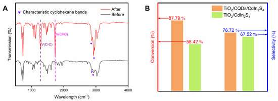 The obtained products were initially analyzed by FT-IR spectroscopy, as shown in Figure 5A. After degradation, the most obvious changes in FT-TR spectra are two newly appeared signals located at ca. 1260 and 1730 cm−1 with high intensity, which can be assigned to the C-C key stretching vibration and aldehyde group, respectively [79,81]. In addition, increased intensity of FT-IR signals were also observed at 2860 and 2930 cm−1, which can be indexed to the cyclohexane bands [82]. These results are in good agreement with the benzaldehyde (m/z = 106) and dimethylcyclohexane (m/z = 112) products recorded by GC-MS (Table 3) [83]. It should be noted that the conversion rates based on GC-MS are slightly higher than that of UV-vis DRS, since some side products might not be reflected by absorption spectra. In contrast to the conversion rate of 58.42% presented by the control group without CQDs, the degradation of PAHs using the optimal TiO2/CQDs/CdIn2S4, (Figure 5B) GC-MS monitored that 87.79% of PAHs was decomposed to benzaldehyde (63.88%), dimethylcyclohexane (21.18%) and side products (2.73%) of very low proportion after 1 h of reaction.