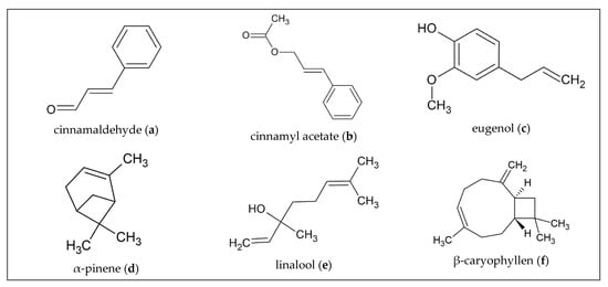 A GC-MS analysis of hydrodistilled C. zeylanicum bark purchased in Turkey identified nine different compounds of the EO: (E)-cinnamaldehyde (68.95%; Figure 1a), benzaldehyde (9.94%), (E)- cinnamyl acetate (7.44%; Figure 1b), limonene (4.42%), eugenol (2.77% Figure 1c), α-pinene (1.64%; Figure 1d), 1,8-cineol (1.55%), linalool (1.38%; Figure 1e) and (E)-cinnamic acid (1.15%). In particular, the major constituent (E)-cinnamaldehyde showed different variations with respect to its total content in the EO. Depending on where the plant material was collected, the content of the individual components of the oil also differed [8].