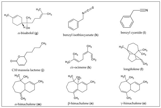 Other compounds found in wood EO by GC analysis were γ-himachalene (12.6%; Figure 1o), (E)-α-atlantone (8.6%), cis-α-bisabolene (2.2%), (E)-γ-atlantone (2.4%), (Z)-γ-atlantone (2.3%), and (Z)-α-atlantone (1.4%). With an overall identification of 98.3%, this accounts for 79.5% sesquiterpene hydrocarbons and 18.9% oxygenated sesquiterpenes [61]. In contrast, Tripathi et al. found atlantones and himachalene epoxides to be major constituents in their study of cedarwood oil [62].