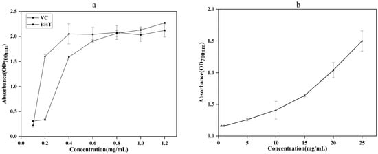 The total reducing capacity of VC, BHT (a) and AgEo (b).