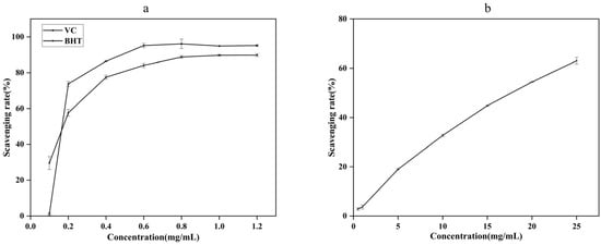The clearance ability of VC, BHT (a) and AgEo (b) for DPPH radical.