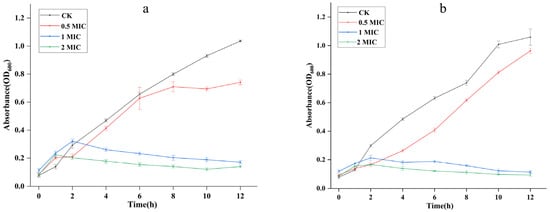 The growth curve assay method according to the method described by Zeng et al. [30], with slight modifications in briefly, logarithmic phase S. aureus and E. coli was diluted to 1 × 107 CFU/mL with nutrient broth. The AgEo was dissolved in tween 80 and added to the cultures to keep the final concentrations of 0.5 MIC, 1 MIC and 2 MIC, only pathogens bacteria were added to the nutrient broth as a control. The cultures were incubated in nutrient broth at 37 ℃ and 120 rpm. At 0, 2, 4, 6, 8, 10 and 12 h, the absorbance of samples at 600 nm was measured.