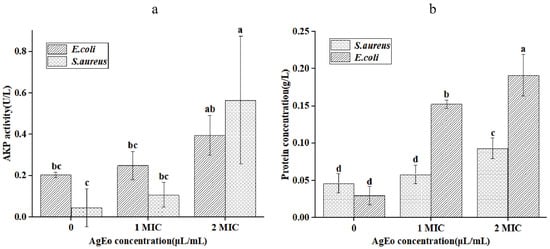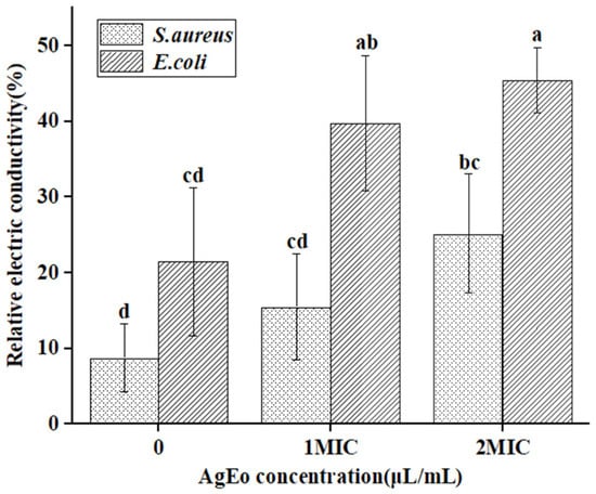 Effect of AgEo against cell membrane permeability of E. coli and S. aureus. Different normal letters indicate significant differences between treatments (p < 0.05, n = 3).
