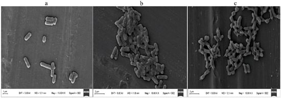 E. coli was used as the research subject and was treated with varied concentrations of AgEo using scanning electron microscopy in order to more intuitively perceive the harm of essential oil to bacterial structure (SEM). The E. coli in the blank group is rod-shaped, has a smooth surface, and has a relatively consistent morphology with no visible dents or breakages, according to Figure 10a,b is E. coli that has been treated with essential oil at the MIC concentration, and damage and atrophy dents have appeared on its surface. Figure 10c is E. coli that has been treated with MBC essential oil concentration. The cell’s surface is rough and uneven, and the cell membrane is clearly ruptured. The findings revealed that the AgEo might deform and destroy the E. coli cell membrane. As a result, the antibacterial action of AgEo could be linked to a change in cell membrane structure (Figure 10).