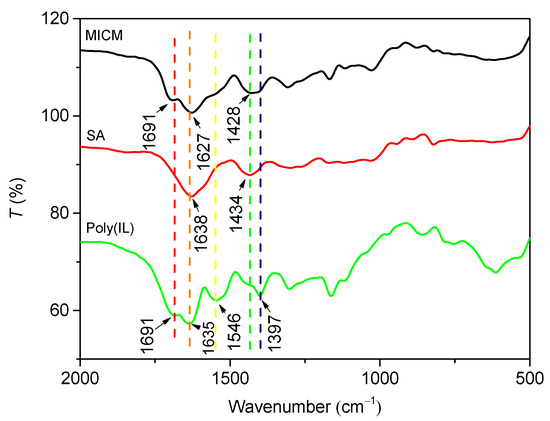 In Figure 3, the two characteristic absorption peaks of SA at 1638 and 1434 cm−1 were attributed to asymmetric and symmetric stretching of the carboxylate group −COO−, respectively [25]. The peak of poly(IL) at 1691 cm−1 was attributed to C = O stretching vibration; the peak at 1546 cm−1 was assigned to the skeleton vibration of the imidazole ring of the IL; and the peaks at 1397 cm−1 was due to the stretching vibration C−N [26]. The infrared spectrum MICM was the rough superposition of the infrared spectra of CA and poly(IL), whereas the peak of −COO− stretching vibration shifted to a lower wavenumber, which indicated that the poly(IL)/CA composite structure has formed [27].