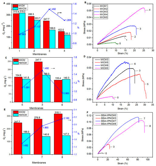 First, the effect of the amount of SA on the adsorption (Figure 5A) and mechanical (Figure 5B) properties were studied, and the membranes (MICM0-4) were prepared according to the experimental conditions in Table S1. The results of MICM0 were cited from our previous work [15]. As shown in Table S1, Figure 5A,B, MICM0 had the best adsorption performance among the five MICMs, but the mechanical strength was the lowest. Therefore, the formation of a composite structure could significantly improve the mechanical strength which increased with the amount of SA; however, Qe decreased with the amount of it. The results indicated that SA was very important to improve the mechanical strength, while the poly(IL) was useful for maintaining good adsorption performance. For MICM3, IF was the highest among the four MICMs (MICM1-4), and relatively high Qe and mechanical strength were achieved.