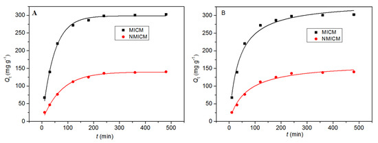 The adsorption kinetic data and fitting curves by the pseudo-first-order model (A) and pseudo-second-order model (B) at 25 °C for MICM and NMICM.