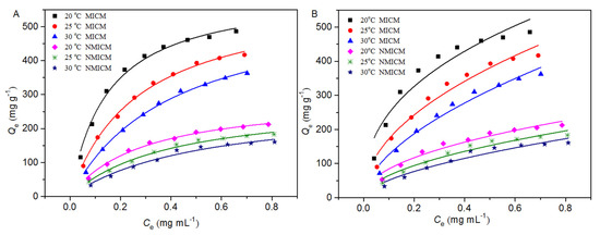 As shown in Figure 7, the equilibrium adsorption capacity of the membranes increased with the initial concentration of BSA. At the same initial BSA concentration and the same temperature, the adsorption capacity of MICM was much higher than that of NMICM because MICM had a large number of specific cavities complementary to BSA in size and shape, while the adsorption capacity of NMICM mainly resulted from non-specific adsorption. At the same initial concentration of BSA, the higher the temperature was, the lower the adsorption capacity of the membranes was, which indicated that the adsorption process was exothermic in nature. The thickness of the boundary layer decreased with temperature, which would increase the tendency of the BSA molecules to escape from the adsorbent surface to the solution phase [32]. Therefore, the adsorption capacity would decrease as the temperature increased.