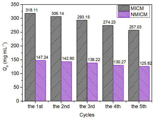 As shown in Figure 8, the adsorption capacity of MICM and NMICM slightly decreased with the reuse cycles because some adsorption sites were destroyed during the reuse, while the adsorption capacity of MICM still remained at 80.8% of the initial value, which indicated that the MICM had good reusability and good stability during several adsorption–desorption cycles.
