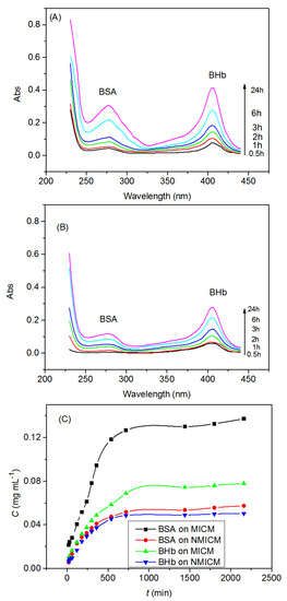The UV-spectra of the BSA/BHb mixed solution in the receptor chamber for MICM and NMICM were shown in Figure 9A,B, respectively, and the concentrations of BSA and BHb at predetermined time intervals were determined to plot the permeation kinetic curves in Figure 9C. The concentrations of BSA and BHb increased rapidly with the permeation time within 720 min, and then increased slowly. The permeation rate of BSA through MICM was much higher than that of BHb, while the permeation rates of BSA and BHb through NMICM were very approximate. Moreover, the permeation rate of BSA through MICM was much higher than that through NMICM.
