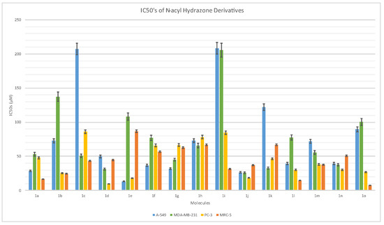 IC50 values of N-acyl hydrazones on A549, MDA-MB-231, and PC3 cell lines and MRC5 healthy human cells. Cells were treated with increasing dosages of (25–300 M) compounds. Control cells were treated with an equal amount of DMSO. Error bars show SEM.