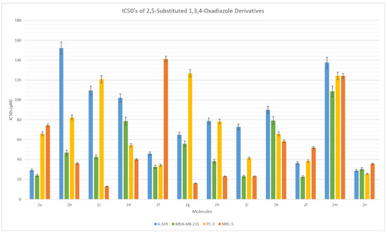 IC50 values of 2,5 substituted 1,3,4-oxadiazoles on A549, MDA-MB-231, and PC3 cell lines and MRC5 healthy human cells. Cells were treated with increasing dosages of (25–300 M) compounds. Control cells were treated with an equal amount of DMSO. Error bars show SEM.