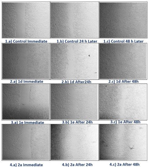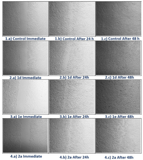 A scratch assay was performed for the three most promising compounds, 1d, 1e, and 2a, based on the data obtained from these scans. In this way, it was anticipated to see if these molecules have an antimetastatic effect.