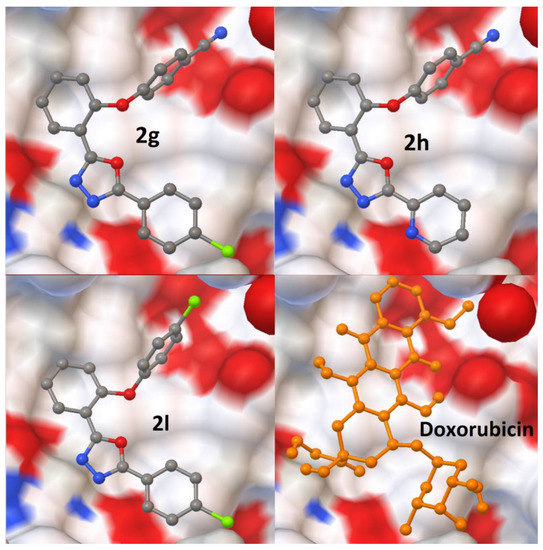 Interaction of the best-docked poses of compounds 4g, 4h, 4l, and reference drug doxorubicin to 1Z5M target.