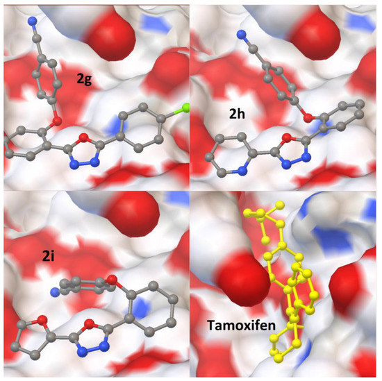 Interaction of the best-docked poses of compounds 4g, 4h, 4i and reference drug tamoxifen to 3KRR target.