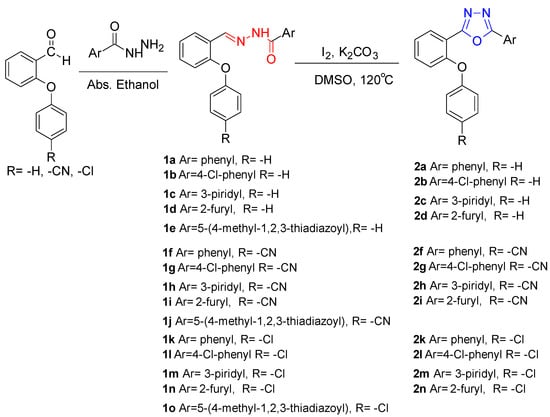 In our previous study [33], we synthesized new N-acyl hydrazones 1a-o, and 2,5-substituted 1,3,4-oxadiazoles 2a-d, 2f-i, and 2k-n, encouraged by the great pharmaceutical potentials of acyl hydrazones and 1,3,4-oxadiazoles. The synthesis route is shown in Scheme 1 below.