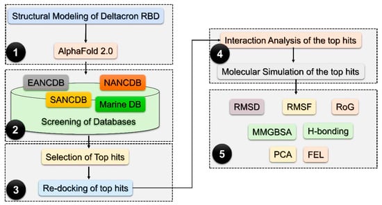 - Khan, A.; Randhawa, A.W.; Balouch, A.R.; Mukhtar, N.; Sayaf, A.M.; Suleman, M.; Khan, T.; Ali, S.; Ali, S.S.; Wang, Y. Blocking key mutated hotspot residues in the RBD of the omicron variant (B. 1.1. 529) with medicinal compounds to disrupt the RBD-hACE2 complex using molecular screening and simulation approaches. RSC Adv. 2022, 12, 7318–7327. [Google Scholar] [CrossRef] [PubMed]