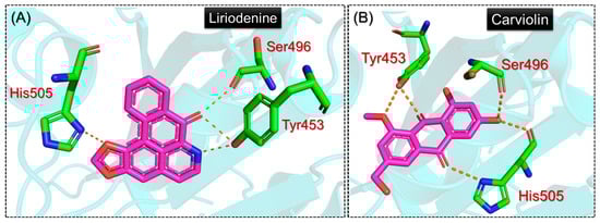 | Liriodenine | Phe497 | Tyr453, Ser496, Tyr501, His505 | −5.9 kcal/mol |
