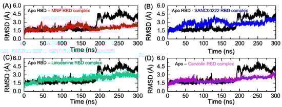 | Parameters | MNP-RBD Complex | SANC00222-RBD Complex | Liriodenine-RBD Complex | Carviolin-RBD Complex |