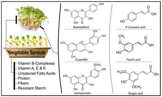 Natural chemical components present in minute amounts in plants are called bioactive chemicals [19]. These substances can interact with one or more live tissue components, resulting in many conceivable outcomes. Bioactive chemicals are naturally occurring essential and nonessential substances present in the food chain that have been shown to impact human health. Antioxidants and polyphenols have been studied for their many biological actions. Due to their unique properties, polyphenols such as protocatechuic acid, vanillic acid, caffeic acid, quercetin, and kaempferol have been shown to protect against oxidative damage [20]. Polyphenols are abundant in sprouts [21]. Polyphenols are reducing agents, hydrogen-donating antioxidants, and singlet oxygen quenchers formed in response to biotic or abiotic stress. Polyphenols’ multifunctionality is due to their dispersion in various tissues and organs of plants at various concentrations. Plants produce phenolic substances that contain at least one aromatic ring with one or more hydroxyl substituents and can be divided into flavonoids and phenolic acids based on their chemical structure. In recent years, phenolic compounds have been extensively studied for their antioxidant, anthelmintic, antiallergenic, anticancer, anti-inflammatory, antiviral, antiulcer, anti-hepatotoxic, antidiarrheal, and antiproliferative properties [3,22]. Micronutrients (vitamins and minerals) are important for tissue maintenance, bone and tooth production, and general health. They help to regulate and coordinate most biological activities and other biochemical and physiological functions by acting as cofactors and coenzymes in diverse enzyme systems. Humans and other creatures require micronutrients at varying levels throughout their lives to coordinate numerous physiological activities and sustain health [23,24]. Vitamins are essential for optimal health and perform vital functions in the human body. Vitamin C, often known as ascorbate, is a micronutrient that humans require. In humans, vitamin C deficiency inhibits the function of several enzymes and can lead to scurvy. Ascorbic acid is a cofactor in a variety of essential enzymatic processes [25], and it is involved in collagen formation. Vitamin E (tocopherols and tocotrienols) protects DNA, low-density lipoproteins, and polyunsaturated fatty acids against oxidative damage. Vitamin E is also involved in hemoglobin production, immune response regulation, and membrane structure stability, and it helps to keep blood coagulation, bone growth, and healing under control. In newborns, vitamin K deficiency can cause hemorrhagic illness and surgical bleeding, muscular hematomas, and intracranial hemorrhages in adults [26].