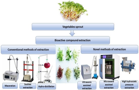 Sprouts and microgreens are edible seedlings of different vegetables and herbs that have become increasingly popular due to their positive health benefits and are now referred to as functional foods or superfoods. Bioactive components have long been appreciated in broccoli seedlings (Brassica oleracea L. var. Italica). Secondary metabolites have been linked to several positive health outcomes. In in vitro and animal studies, broccoli seedlings have been shown to have health benefits. A current study has summarized previous research on the bioactive components and bioactivities of various broccoli derivatives, as well as the mechanisms of action associated with them [57]. Conventional and new techniques can be used to extract bioactive compounds from different types of vegetable sprouts, as shown in Figure 2.