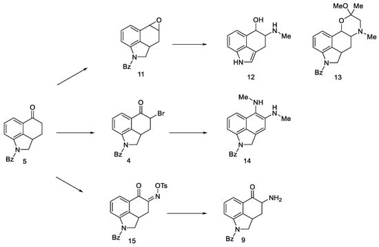 Very first attempts to obtain lysergic acid. Using the obtained ketone 5, attempts were made to introduce nitrogen into the C4 position (Figure 10).