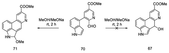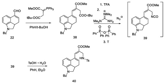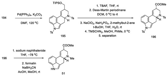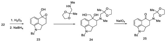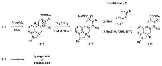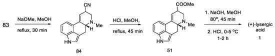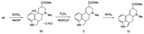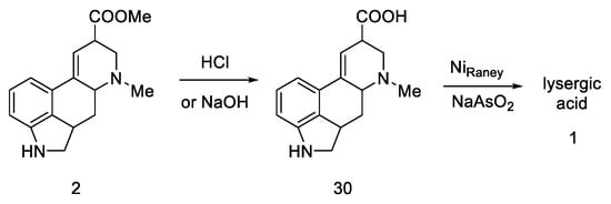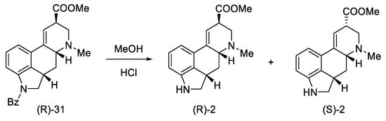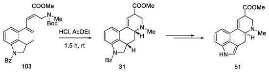 Woodward, who was the first to perform a total synthesis of lysergic acid, proposed a reaction mechanism explaining epimerization at both chiral centers. These postulates were proved spectrally, experimentally, and crystallographically by Ramage two decades later. They proposed that the racemization process was via an achiral tricyclic intermediate (Figure 8), which could be formed by retro Michael fragmentation [36].