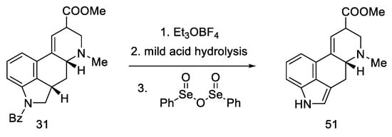 - Ninomiya, I.; Hashimoto, C.; Kiguchi, T.; Naito, T.; Barton, D.H.R.; Lusinchi, X.; Milliet, P. Dehydrogenation with Benzeneseleninic Anhydride in the Total Synthesis of Ergot Alkaloids. J. Chem. Soc. Perkin Trans. 1 1990, 707–713. [Google Scholar] [CrossRef]