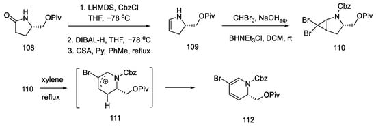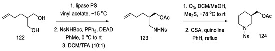 - Jarvis, S.B.D.; Charette, A.B. Synthesis of Enantiopure Substituted Piperidines via an Aziridinium Ring Expansion. Org. Lett. 2011, 13, 3830–3833. [Google Scholar] [CrossRef]