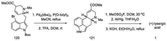 - Umezaki, S.; Yokoshima, S.; Fukuyama, T. Total Synthesis of Lysergic Acid. Org. Lett. 2013, 15, 4230–4233. [Google Scholar] [CrossRef]