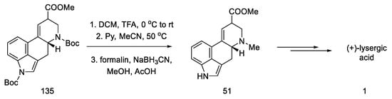 - Kanno, R.; Yokoshima, S.; Kanai, M.; Fukuyama, T. Total Synthesis of (+)-Lysergic Acid. J. Antibiot. 2018, 71, 240–247. [Google Scholar] [CrossRef]
