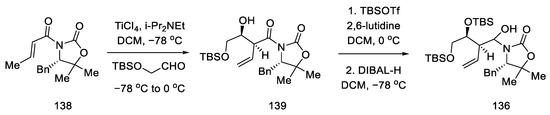 - Crimmins, M.T.; King, B.W.; Tabet, E.A.; Chaudhary, K. Asymmetric Aldol Additions: Use of Titanium Tetrachloride and (−)-Sparteine for the Soft Enolization of N-Acyl Oxazolidinones, Oxazolidinethiones, and Thiazolidinethiones. J. Org. Chem. 2001, 66, 894–902. [Google Scholar] [CrossRef]