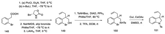 - Inuki, S.; Oishi, S.; Fujii, N.; Ohno, H. Total Synthesis of (±)-Lysergic Acid, Lysergol, and Isolysergol by Palladium-Catalyzed Domino Cyclization of Amino Allenes Bearing a Bromoindolyl Group. Org. Lett. 2008, 10, 5239–5242. [Google Scholar] [CrossRef]