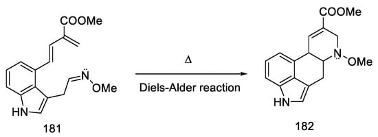 - Oppolzer, W.; Francotte, E.; Bättig, K. Total Synthesis of (±)-Lysergic Acid by an Intramolecular Imino- Diels—Alder Reaction. Preliminary Communication. Helv. Chim. Acta 1981, 64, 478–481. [Google Scholar] [CrossRef]