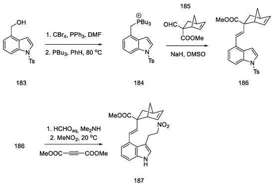 - Marino, J.P.; Osterhout, M.H.; Padwa, A. An Approach to Lysergic Acid Utilizing an Intramolecular Isomuenchnone Cycloaddition Pathway. J. Org. Chem. 1995, 60, 2704–2713. [Google Scholar] [CrossRef]