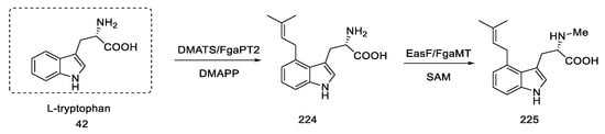 - Plieninger, H.; Wagner, C.; Immel, H. Synthese von 4-[E-4-Hydroxy-3-Methyl-Δ2-Butenyl]-Tryptophan-[4-14C] Sowie -Tryptamin-[4-14C] Und Einbau in Clavin-Alkaloide. Justus Liebigs Ann. Chem. 1971, 743, 95–111. [Google Scholar] [CrossRef]